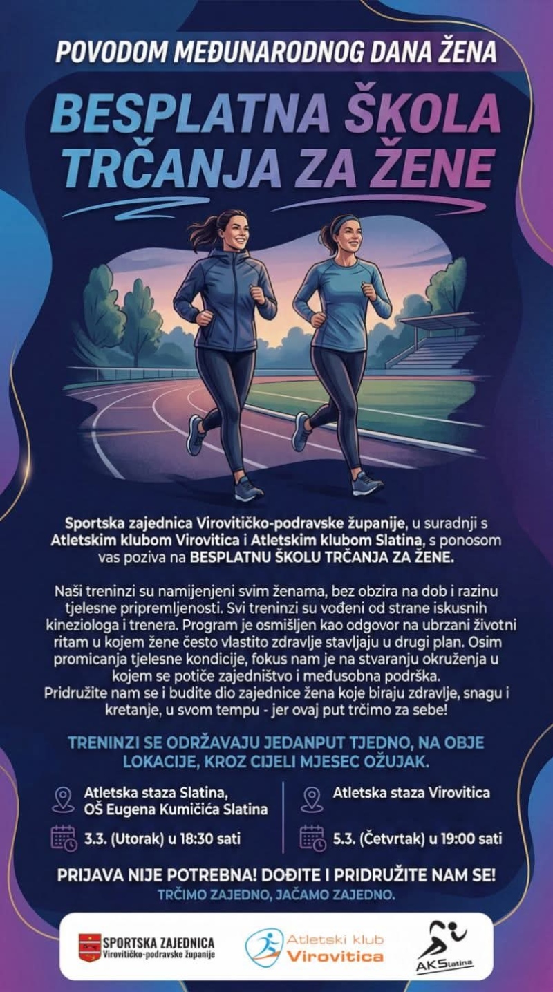 Sportska zajednica Virovitičko-podravske županije, u suradnji s Atletskim klubom Slatina, poziva na besplatnu školu trčanja za žene. Treninzi se održavaju jedanput tjedno, u mjesecu ožujku, na atletskoj stazi OŠ Eugena Kumičića, i počinju 03. ožujka 2026. godine u 18:30 sati. Prijave nisu potrebne, jednostavno dođite…