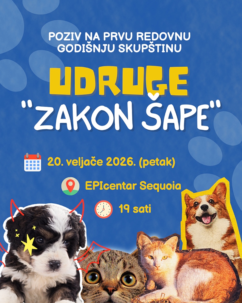 Udruga Zakon šape, poziva članove i zainteresirane sugrađane, u petak, 20. veljače 2026. godine. sa početkom u 19:00 sati, u prostoru EPIcentra Sequoia, na prvu redovitu skupštinu.