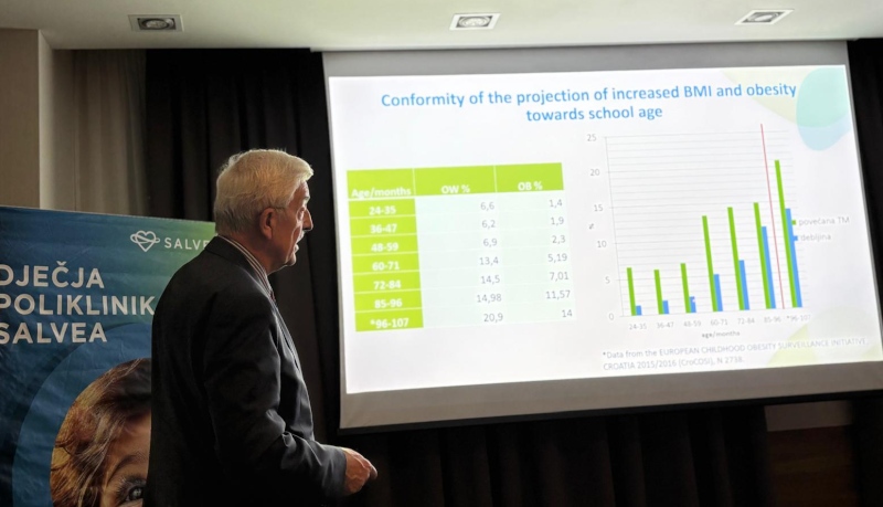 Prvo predavanje održao je izv. prof. dr. sc. Milivoj Jovančević, specijalist pedijatar, koji je govorio o problemu dječje pretilosti u Hrvatskoj. Predstavio je zabrinjavajuće podatke prema kojima je više od 36 % djece u dobi od 8 do 9 godina prekomjerne tjelesne mase ili pretilo, dok čak 10 % djece ima povišene masnoće u krvi. Posebno je istaknuta uloga pravodobne procjene nutritivnog statusa, praćenja indeksa tjelesne mase i omjera struka i visine, kao i nužnost trajne promjene životnih navika cijele obitelji. Kroz prikaz konkretnog kliničkog slučaja naglašeno je kako su bez aktivnog sudjelovanja roditelja dugoročni rezultati liječenja teško održivi.