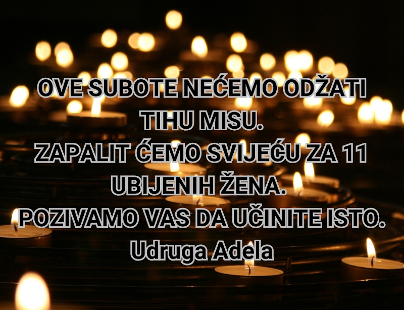 Udruga Adela iz Osijeka odlučila je kako ove prve subote u mjesecu, kada se obilježava blagdan Svih Svetih, neće održati Tihu misu, a iz poštovanja prema blagdanu i istinskim vjernicima. Umjesto da stojimo kao reakcija na klečanje i takozvanu molitvu muškaraca na trgovima, kao što smo do sada, zapalit ćemo svijeću za jedanaest žena ubijenih u Hrvatskoj ove godine, svatko u krugu svojih najdražih.